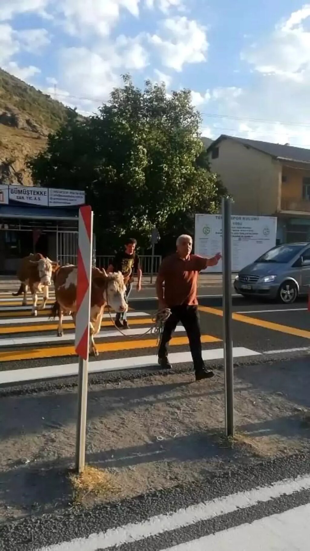 Gümüşhane’nin merkeze bağlı Tekke beldesinde bir vatandaş, büyükbaş hayvanlarını trafiğin işlek olduğu Gümüşhane-Bayburt karayolunda yaya geçidinden karşıya geçirmek zorunda kaldı.